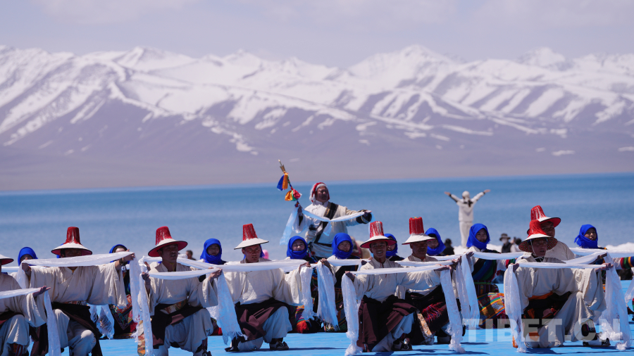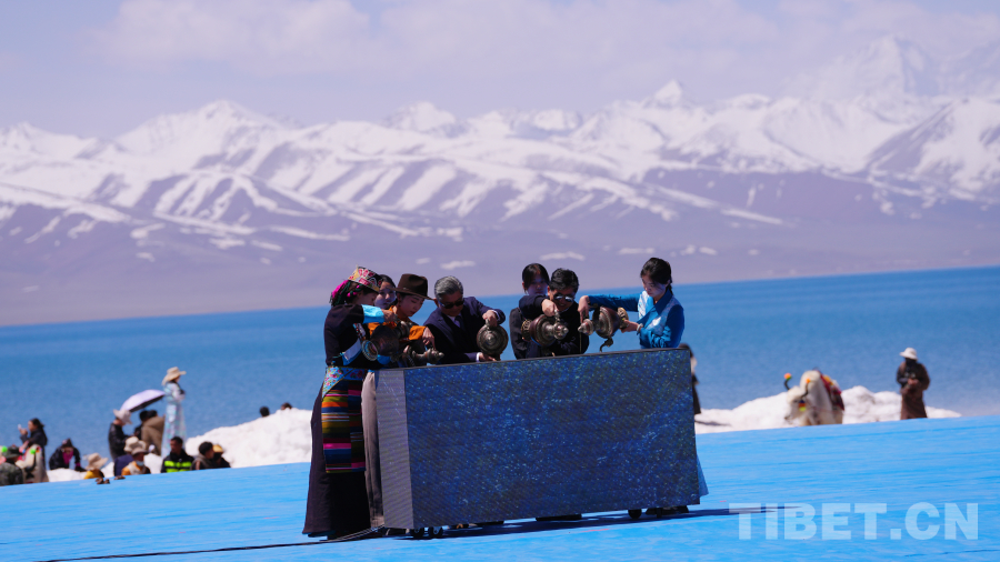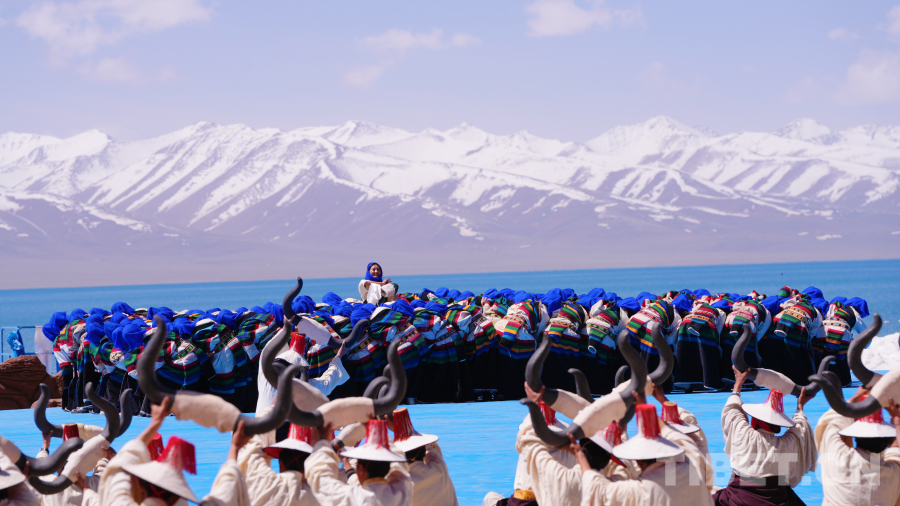 念青唐古拉山脈皚皚雪山高聳入云,清澈碧藍(lán)的納木錯(cuò)湖水一望無際,牧民牽著白牦牛在湖邊悠閑地散步,成群的棕頭鷗發(fā)出歡快的叫聲在空中自由飛翔……在令人如癡如醉的絕美景色為背景的祈福儀式上,身著盛裝的300名演員結(jié)合當(dāng)?shù)孛袼孜幕?,手捧哈達(dá)、牛角、烏爾朵(拋石器)等呈現(xiàn)盛大的祈福儀式,給現(xiàn)場觀眾帶來一場羌塘高原別具一格的視覺盛宴。