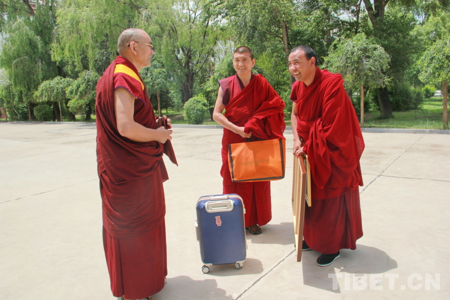 圖為青海省藏語(yǔ)系佛學(xué)院教務(wù)處副處長(zhǎng)、特級(jí)經(jīng)師悟嘉倉(cāng)(右一)與準(zhǔn)備離校的畢業(yè)學(xué)僧交談 攝影:劉莉