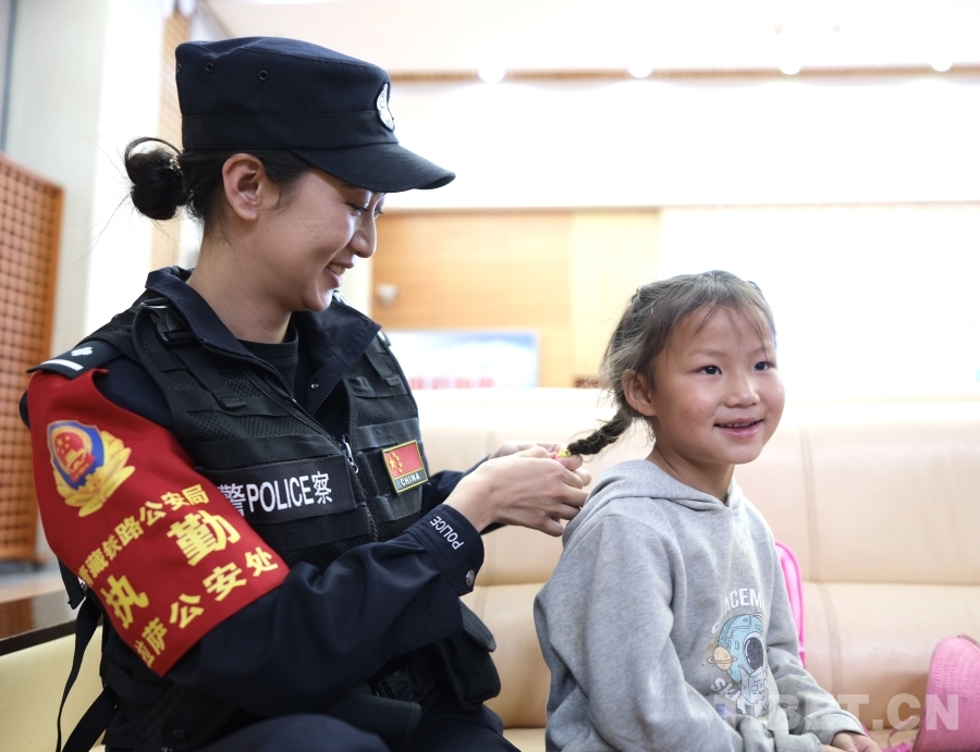 圖為5月31日,馬曉琴在執(zhí)勤時,深受小朋友的喜愛,拉著格?;ㄞp起頭發(fā),想要跟格桑花一樣靚麗 攝影:賀瑞明