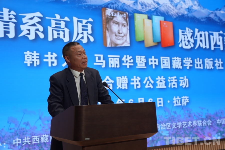 中國西藏網(wǎng)訊 6月6日上午,由西藏自治區(qū)黨委宣傳部主辦,自治區(qū)文聯(lián)、中國藏學出版社承辦的“情系高原 感知西藏——韓書力、馬麗華暨中國藏學出版社聯(lián)合贈書公益活動”在西藏美術館學術報告廳舉辦。自治區(qū)黨委宣傳部副部長何瑞,中國藏學出版社社長洪濤,自治區(qū)文聯(lián)黨組成員、副主席陳人杰,自治區(qū)黨委原常委、自治區(qū)政協(xié)原副主席德吉措姆,自治區(qū)文聯(lián)原主席、西藏美術家協(xié)會原主席韓書力,中國藏學出版社原總編輯、自治區(qū)文聯(lián)原副主席、西藏作家協(xié)會原副主席馬麗華等參加活動。
