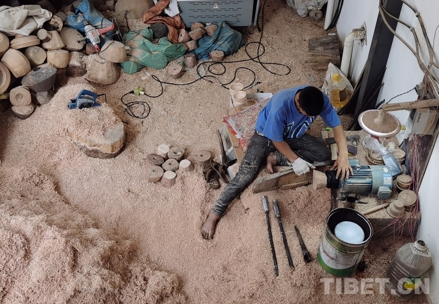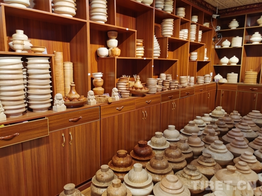 我們首先來到的是四川省非物質(zhì)文化遺產(chǎn)項(xiàng)目——藏族民間車模技藝體驗(yàn)基地?;匾粚邮枪ぷ鲄^(qū),一位師傅正在全身心制作木質(zhì)生活用具,絲毫沒有察覺我們的到來。于是沒有過多打擾,我們徑直來到二樓展品陳列區(qū)。藏族民間車模技藝傳承人格絨次仁的兒子洛絨次仁拿起一個(gè)木碗,臉上露出樸實(shí)而靦腆的微笑介紹道,“這些都是選用樹瘤制作而成,一般選用鵝掌木、杜鵑等15類樹木,因?yàn)橹蹦救菀琢验_。為了用具不裂開,處理后的樹瘤煮水后需晾干五至六個(gè)月,一個(gè)木碗制作工序可能要長(zhǎng)達(dá)半年才能完成。此項(xiàng)技藝在家族傳承至今已有四代,我們要做就做好一點(diǎn)?!甭褰q次仁大哥希望更多人能了解這項(xiàng)非物質(zhì)文化遺產(chǎn),有更多人愿意來傳承學(xué)習(xí)這份技藝,有更多人喜歡他們制作的這些木質(zhì)生活用具。