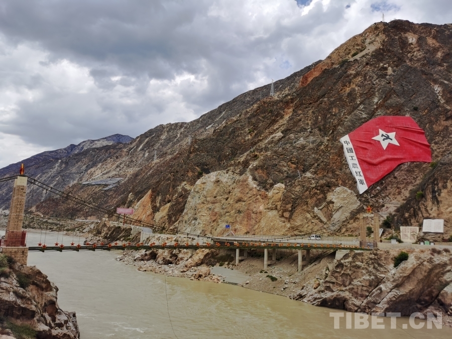 圖為中國(guó)工農(nóng)紅軍巖旗和橫跨金沙江的賀龍橋 攝影:鄒慧