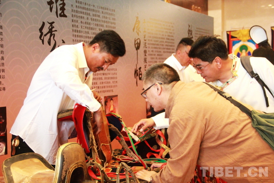 圖為“花開(kāi)道孚 潤(rùn)道有聲”道孚縣文化傳承發(fā)展座談會(huì)與會(huì)嘉賓在道孚縣非物質(zhì)文化遺產(chǎn)展上了解馬具制作工藝 攝影:劉莉