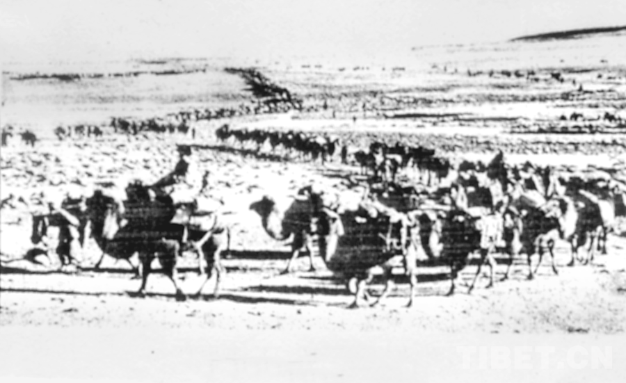 圖為1954年,青藏公路修筑大軍的駱駝運(yùn)輸隊(duì)