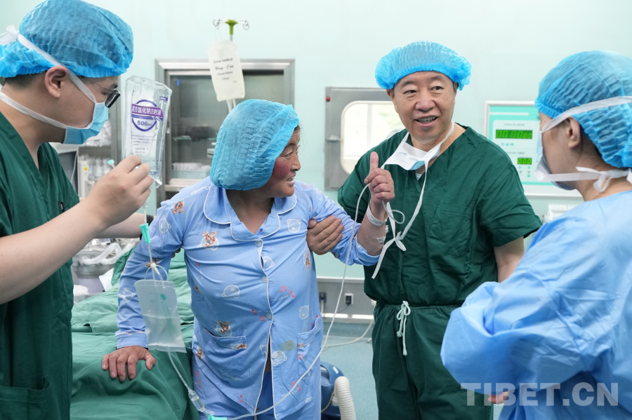圖為手術(shù)室內(nèi),剛剛完成局部麻醉微創(chuàng)椎管擴大減壓手術(shù)的藏族患者穆女士在張西峰(左三)的指導下成功站立,并為張教授的精湛醫(yī)術(shù)點贊。