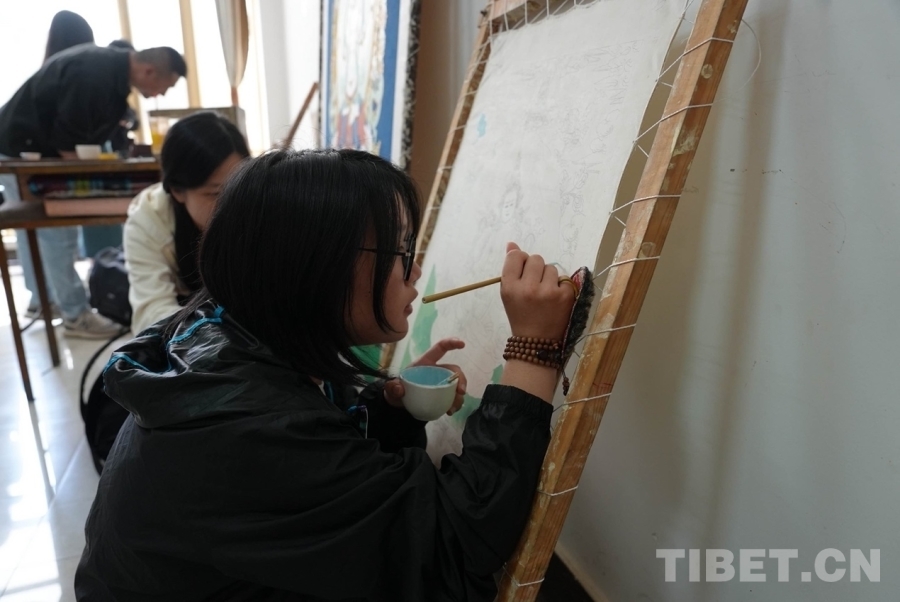 在熱貢畫院,師生們親眼目睹了畫師們的創(chuàng)作過程。畫師們?nèi)褙炞⒌乩L制著唐卡,一筆一畫間盡顯對藝術(shù)的執(zhí)著與熱愛。他們精湛的技藝和嚴謹?shù)膽B(tài)度讓大家深受觸動,更深刻地體會到了熱貢藝術(shù)的博大精深。