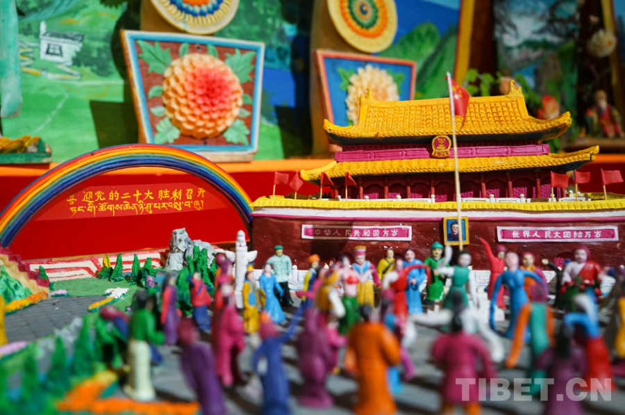 瓊科寺酥油花2018年被列入西藏自治區(qū)第五批自治區(qū)級非物質(zhì)文化遺產(chǎn)代表性項目?!斑@個展廳里最大的一幅作品,是我們寺院內(nèi)20多名僧人花10天時間制作完成的。我們寺院每年都會有符合時代旋律的新時代題材作品創(chuàng)作產(chǎn)生,我希望通過我們一年一年、一點一滴的努力,能夠終有一日將酥油花申報為國家級非物質(zhì)文化遺產(chǎn)代表性項目?!杯偪扑滤钟突ǚ沁z傳承人阿旺西尼說。