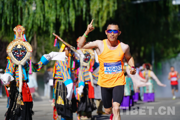 圖為 2024拉薩半程馬拉松18公里處參賽選手途經(jīng)拉魯濕地國家級自然保護(hù)區(qū),拉薩市城關(guān)區(qū)藏戲藝術(shù)團(tuán)以藏戲的形式為選手加油助威 攝影:趙振宇