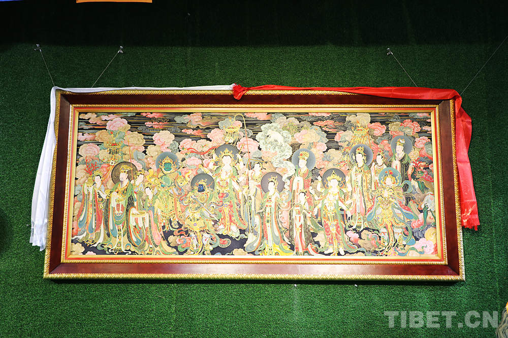 此次展覽中不僅有20余幅不同年代珍貴傳統(tǒng)唐卡,同時還重點(diǎn)展出了掐絲琺瑯唐卡。據(jù)相關(guān)負(fù)責(zé)人介紹,此類作品以傳統(tǒng)手工掐絲為基礎(chǔ),以金箔、金絲鑲嵌而成,制作技藝復(fù)雜、用料講究,風(fēng)格獨(dú)特且具有鮮明民族特點(diǎn)。兩種非遺的結(jié)合,是文化傳承與技術(shù)創(chuàng)新的生動實(shí)踐,讓觀眾在觀賞中體驗(yàn)到非遺的魅力。