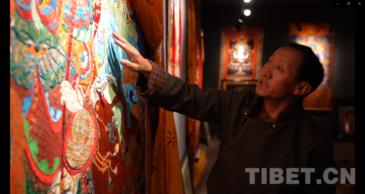 圖為國(guó)家級(jí)非遺項(xiàng)目拉薩堆繡唐卡傳承人羅布在介紹自己的唐卡作品 攝影:謝林翰