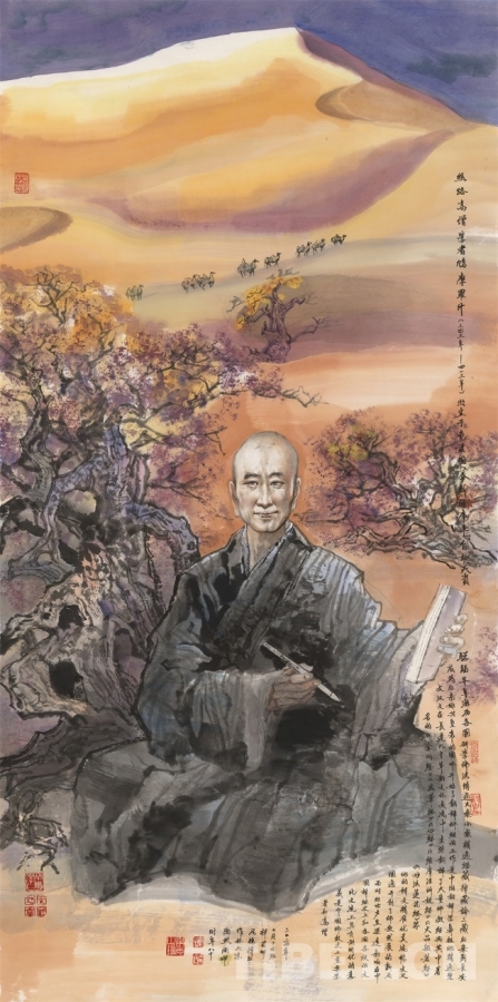 圖為尼瑪澤仁繪制并捐贈給鳩摩羅什寺的國畫作品《絲路高僧學者鳩摩羅什》