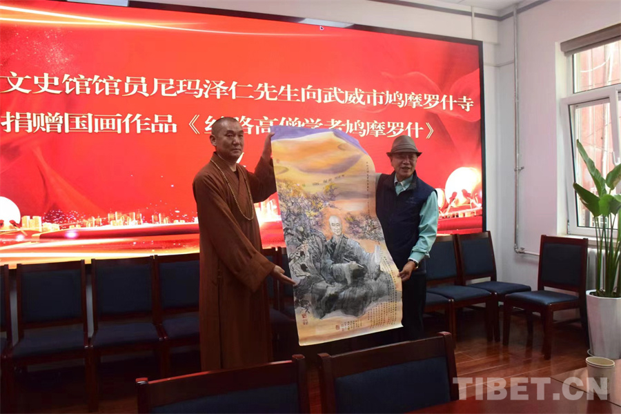 據(jù)悉,尼瑪澤仁在此前已將精心創(chuàng)作的《元蕃瑞和圖》捐贈給甘肅省武威市涼州會盟紀念館,此次又將創(chuàng)作的《絲路高僧學者鳩摩羅什》繪畫精品捐贈給武威市鳩摩羅什寺。尼瑪澤仁表示,鳩摩羅什翻譯許多佛法經(jīng)典,促進絲綢之路上的文化交流,作為畫家,我想紀念他的偉大貢獻,于是創(chuàng)作了這幅繪畫送給鳩摩羅什寺。