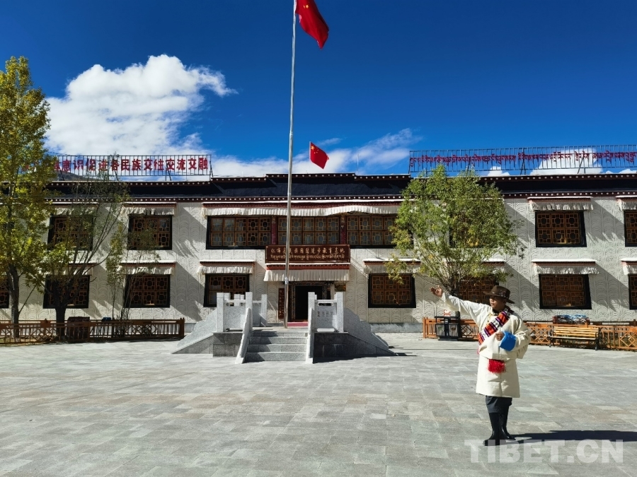 圖為拉巴次仁介紹位于普納村的仁布縣民族團(tuán)結(jié)進(jìn)步教育基地 攝影:蔣馨悅