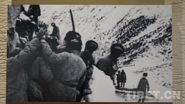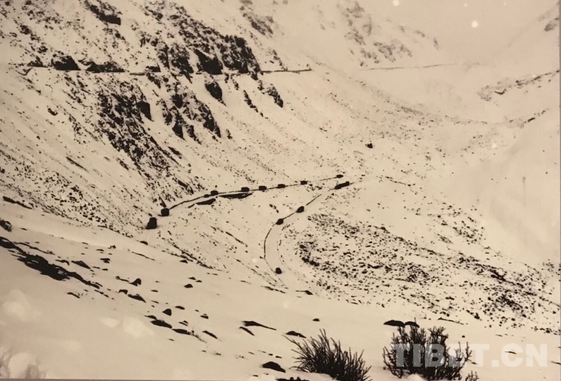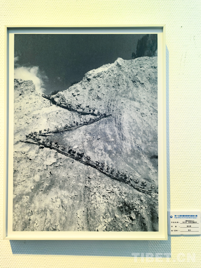 圖為第17屆西藏珠穆朗瑪攝影大展展出的藍志貴于1951年進軍西藏途中所拍攝的《翻越泥巴山》 翻拍:王淑