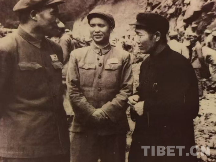 圖為1953年秋,西南軍區(qū)副司令員兼參謀長李達代表賀龍司令員慰問川藏公路筑路部隊官兵,陳明義(中)、穰明德陪同李達(左一)在西藏波密視察公路修建進展 圖由陳亦軍提供