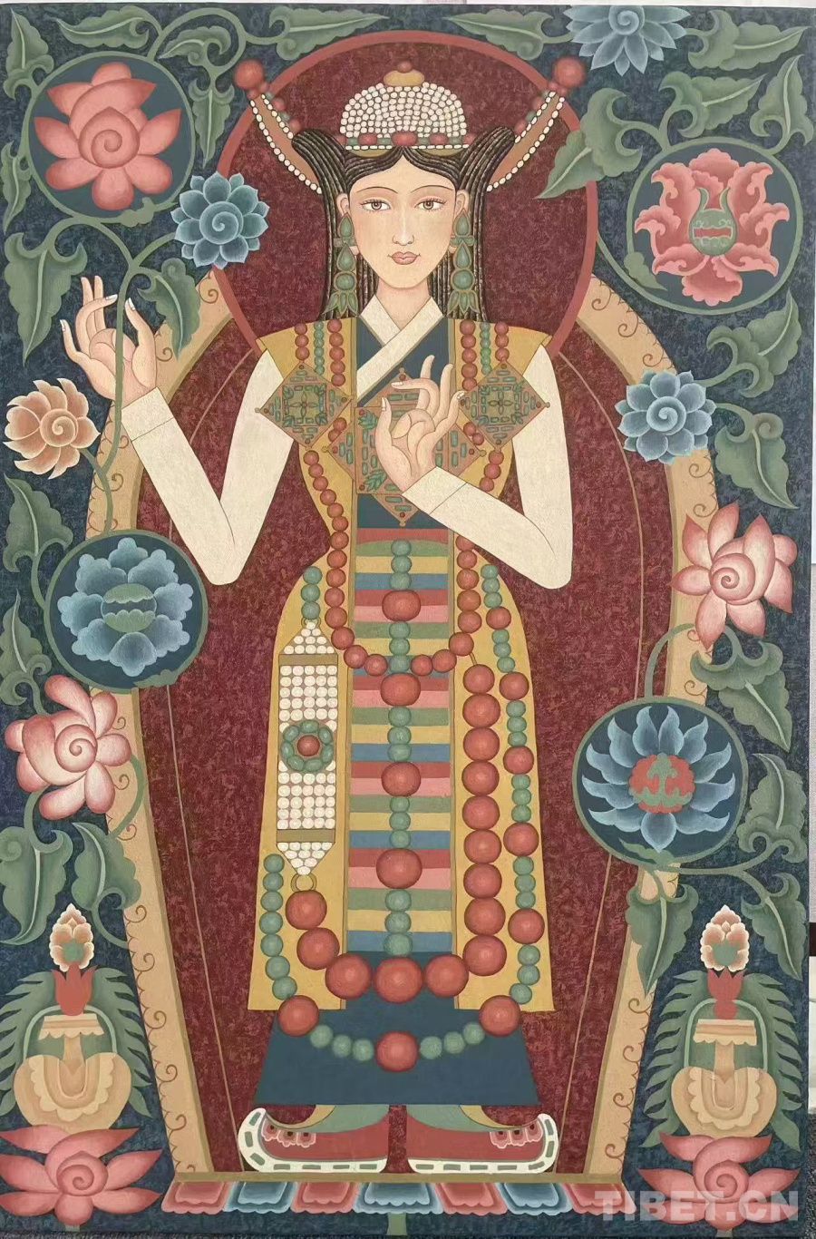 本屆西藏精品唐卡展以“傳承·創(chuàng)新·和諧”為主題,共展出60幅唐卡作品和20幅當代布面重彩作品,作品創(chuàng)作題材廣泛、風格流派多樣,藝術樣式豐富,不僅展現了傳統唐卡的精湛技藝,也融入了現代元素,展現了藝術家們對傳統與現代的深刻理解和獨特見解。這種多樣化、多元化的藝術展示,不僅使作品具有了更為豐富的表現力和視覺沖擊力,同時也為西藏當代唐卡藝術創(chuàng)作注入了新的活力,為西藏當代唐卡藝術多元發(fā)展奠定了良好的基礎。