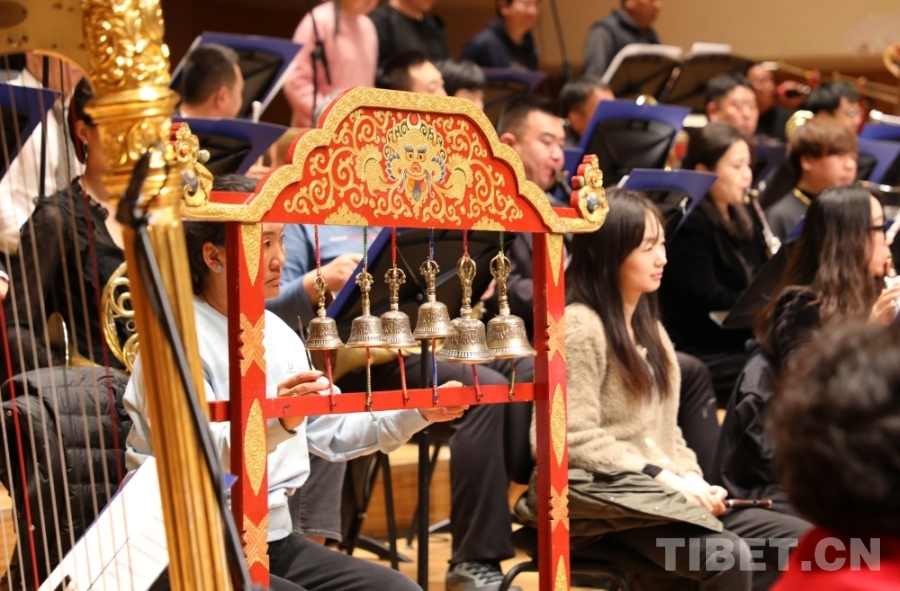 “我們交響樂當(dāng)中使用了不少民族樂器,有藏族的傳統(tǒng)樂器藏大號(hào)、藏鈸、扎木念、赤布(藏鈴),也有二胡、鼓、笛等等,這也使得作品跟其他樂團(tuán)不一樣?!蹦岈斦f,“交響樂有了民族樂器的加入,這種中西結(jié)合讓作品國際范兒中有了民族風(fēng)味,這也是我們所做的一些創(chuàng)新和融合,也展現(xiàn)了西藏音樂特有的魅力?!?/p>