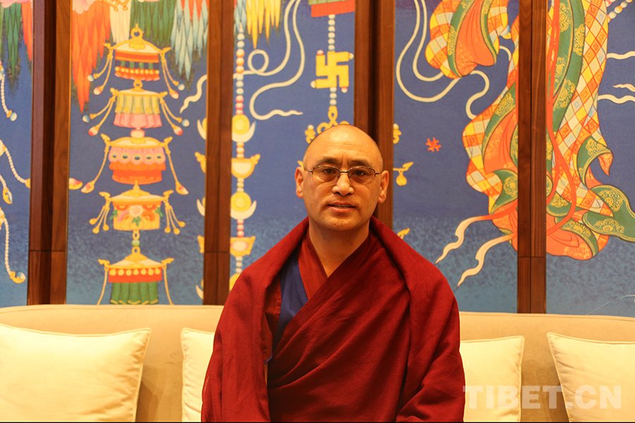 圖為藏傳佛教第十六屆“拓然巴”高級學(xué)銜獲得者、旺達(dá)寺民管會(huì)主任澤翁巴登接受記者采訪 攝影:龍真多吉