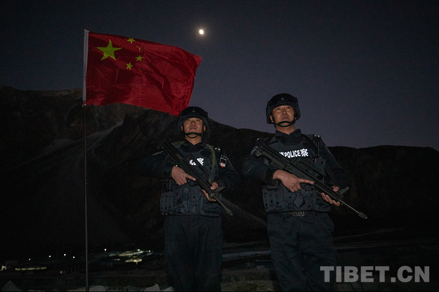 圖為西藏出入境邊防檢查總站色邊境派出所移民管理警察在公漳浦執(zhí)勤點月光下執(zhí)勤