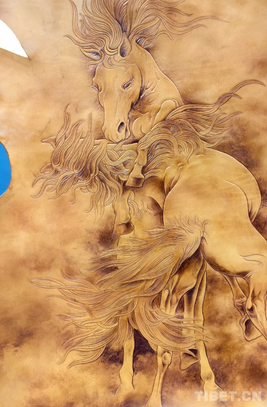 圖為多縣長(zhǎng)江一號(hào)牧場(chǎng)參展的牛皮雕刻畫(huà)《青海雙驄》