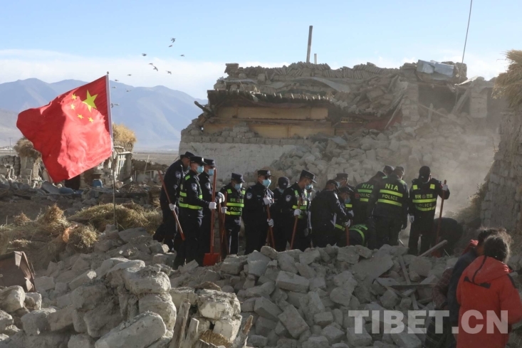 圖為西藏移民管理警察在國旗下開展地震救援,守護人民群眾 攝影:郭遠敬