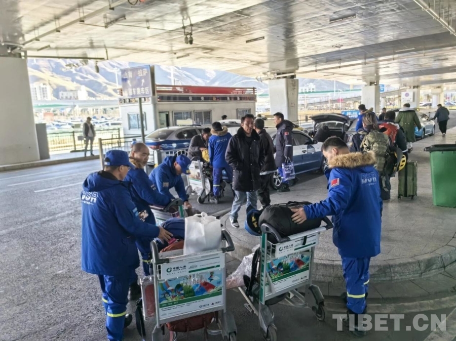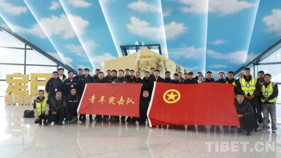 圖為西藏區(qū)局、西南空管局的黨員及青年突擊隊抵達(dá)定日機(jī)場 攝影:白瑪群宗