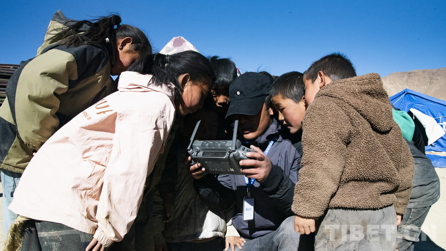 圖為在左措村受災群眾安置點,小朋友們圍觀無人機空中視角 攝影:趙振宇