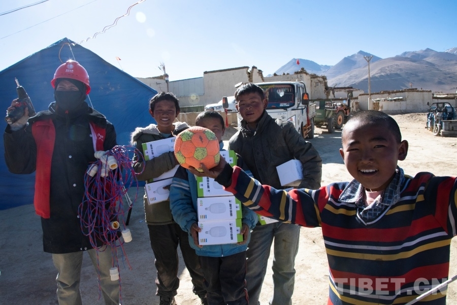 “來,你們拿著這些燈泡跟著我!”在次仁旦增和其他兩位組員的組織下,小男孩們化身為措昂村受災(zāi)安置點的小小志愿者,簇擁著從這些從山南前來支援的國家電網(wǎng)工作人員走進一間間帳篷,為站在高處正在架設(shè)電線的叔叔們遞上工具和燈泡。