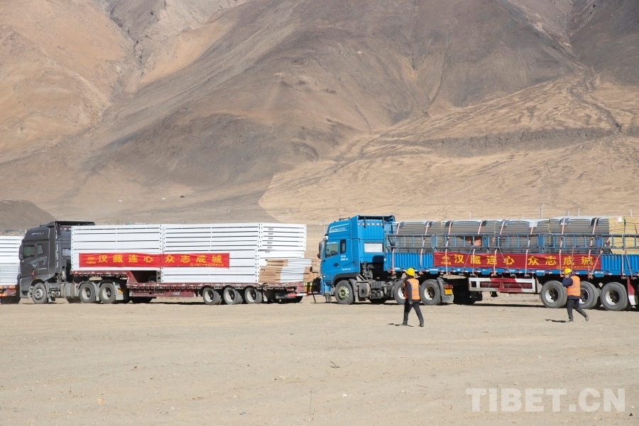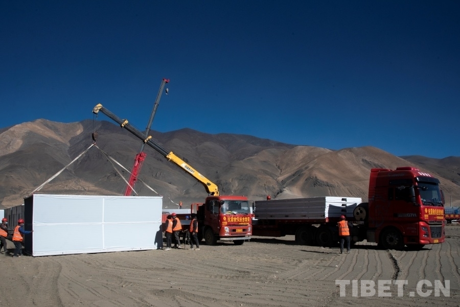 圖為工作人員正在日喀則市定日縣長(zhǎng)所鄉(xiāng)森嘎村內(nèi)抓緊搭建活動(dòng)板房 攝影:趙振宇