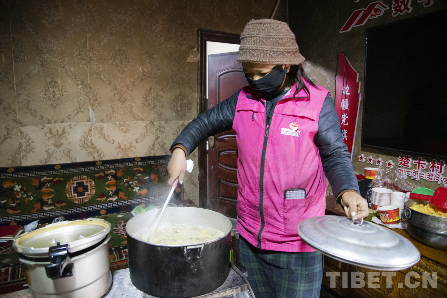 圖為達(dá)娃央宗正在廚房?jī)?nèi)與村巾幗服務(wù)志愿者為村莊老人小孩以及工作人員制作午餐 攝影:趙振宇