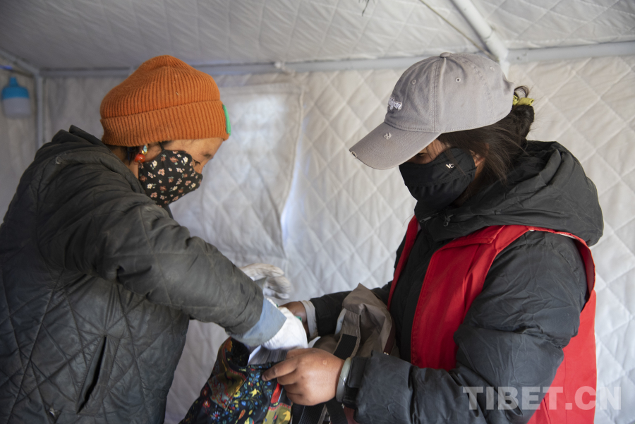 圖為阿旺德金(右)正在幫助帳篷安置點(diǎn)內(nèi)的群眾收拾個(gè)人物品準(zhǔn)備搬進(jìn)活動(dòng)板房 攝影:趙振宇