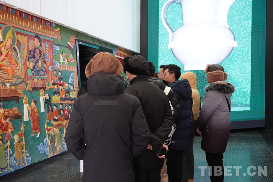“合同一家”部分展示了布達(dá)拉宮館藏織物、唐卡、造像等精美文物。一件件來自江南的織物,一幅幅風(fēng)格融合的唐卡,巧妙地展現(xiàn)出一種獨(dú)特的和諧之美。這種融合不僅是一場視覺上的盛宴,更深層次地引發(fā)了參觀游客對于民族文化交流的共鳴。它們仿佛是茶馬古道上的使者,承載著西藏與祖國各地各民族往來交流的歷史,讓參觀游客在贊嘆其工藝精湛的同時,也能深刻感受中華民族文化的厚重與魅力。