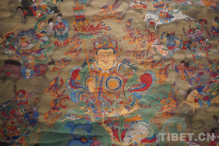 圖為清財(cái)神像唐卡局部。這幅主尊黃財(cái)神及八大馬王唐卡,主尊周圍生動地繪滿了傳統(tǒng)道教水陸畫中常見的人物形象,反映了古代青藏高原與河西走廊地區(qū)的文化交流,體現(xiàn)出我國多民族文化在邊疆地區(qū)的廣泛互動 攝影:張宇