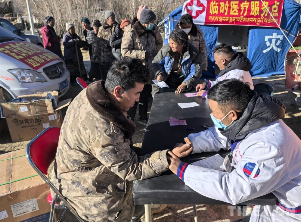 圖為日喀則邊那倉藏醫(yī)院醫(yī)護(hù)人員為災(zāi)區(qū)群眾巡診問診
