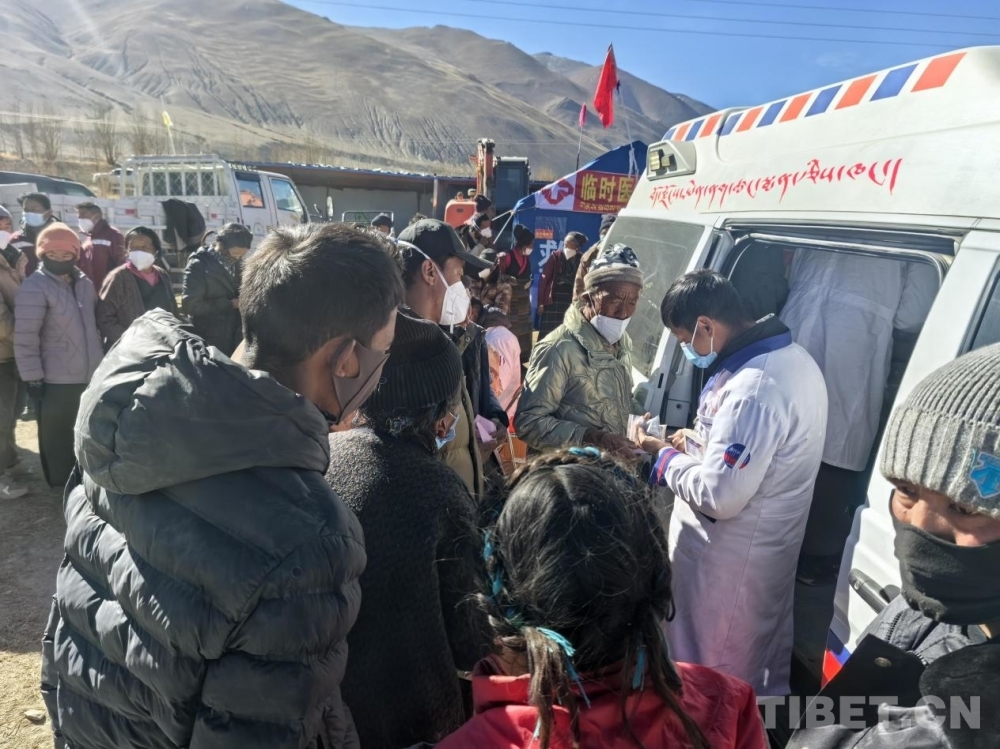 圖為邊那倉藏醫(yī)院醫(yī)護(hù)人員為災(zāi)區(qū)群眾發(fā)放藥品