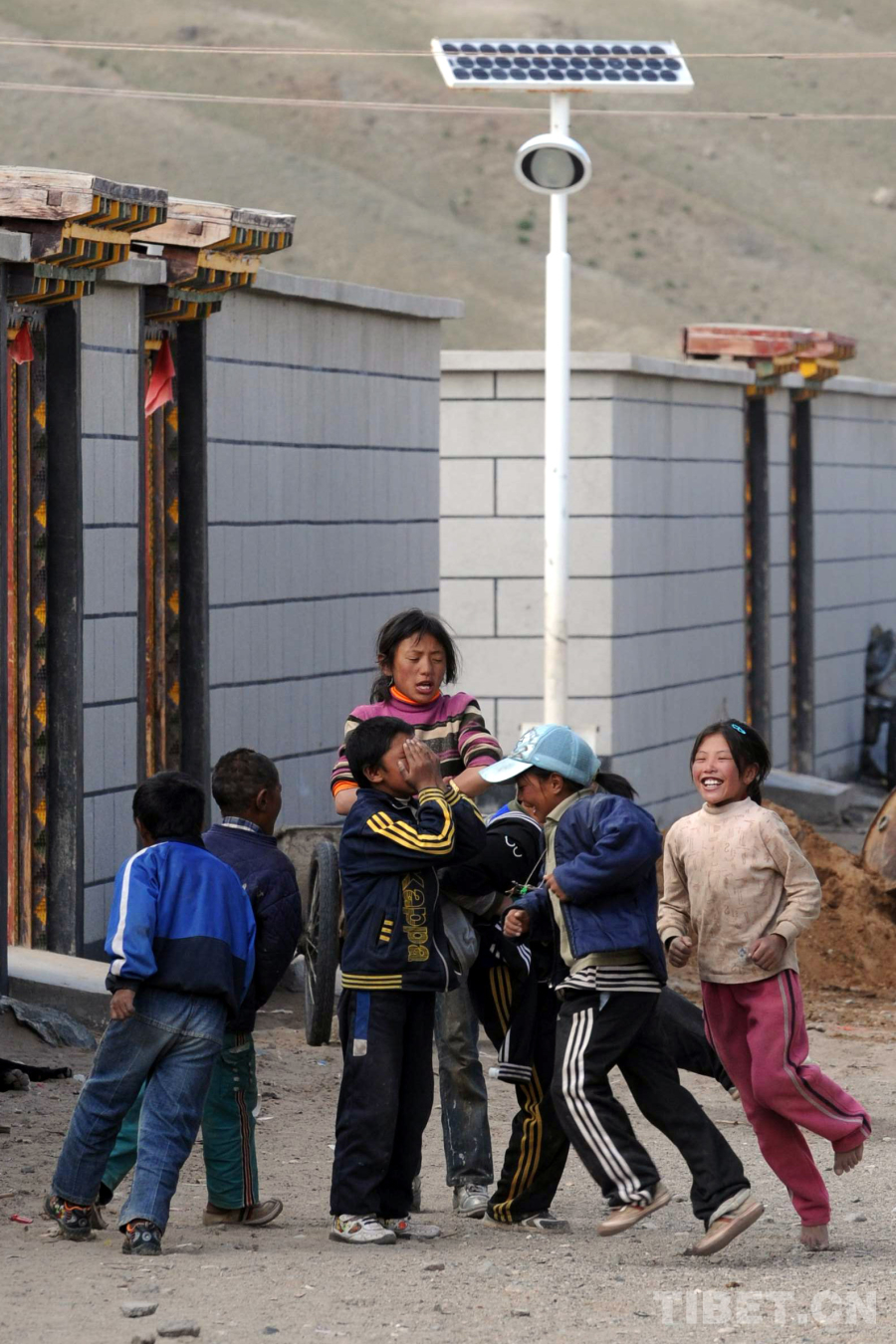圖為雙湖特別區(qū)(現(xiàn)雙湖縣)嘎措鄉(xiāng)新房前的孩子們?cè)谔?yáng)能燈柱下玩耍(唐召明2009年8月1日攝)