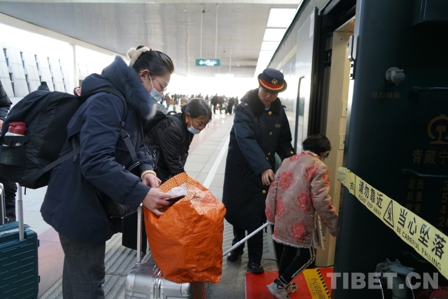 不一會,等待檢票上車的人排起了長隊,他們是來拉薩朝圣結(jié)束準備回家的藏族老人,他們是結(jié)束了一年工作回鄉(xiāng)過年的外地務工人員,他們是來拉薩探親的母子,他們是去成都與家人團聚的母女三人……短短15節(jié)車廂,囊括了中華民族各族群眾在春節(jié)來臨時短暫相聚于火車上的世間百態(tài):大包小包的行李、火車上準備的食物、手中的轉(zhuǎn)經(jīng)筒、和媽媽撒嬌的孩子、手機上跳動的畫面……