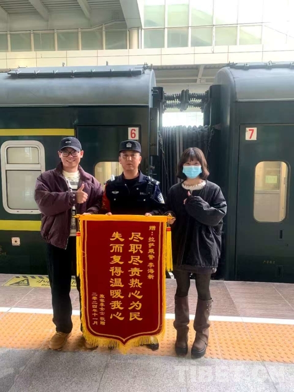 圖為旅客為李警長送錦旗。2024年11月,李警長在列車巡檢時發(fā)現(xiàn)一部被旅客遺失的手機,在與失主取得聯(lián)系后將手機送還?!∈茉L者供圖