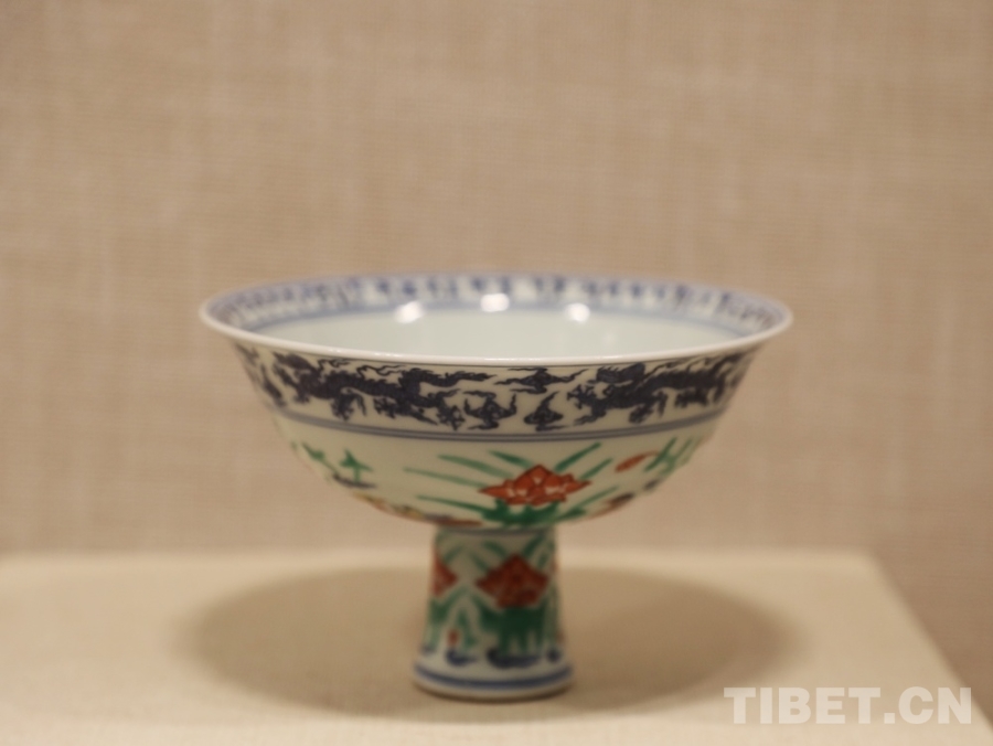 圖為明宣德青花五彩蓮池鴛鴦紋高足碗。經(jīng)鑒定,這只內(nèi)沿書(shū)寫(xiě)著藏文的高足碗是明代中央政府向薩迦寺賜送的實(shí)物見(jiàn)證 攝影:王茜