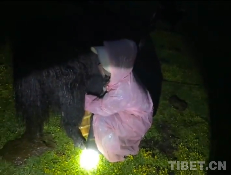 到了牛圈里,我發(fā)現(xiàn)大部分的牦牛都把腦袋斜靠在自己的肚子旁,閉著眼睛睡覺呢。我想很多人都沒見過牦牛睡覺的畫面吧?它們睡覺不是站著,而是躺下后前后腿全部收緊,把自己裹成一團,頭不是往前伸著,而是斜著貼緊自己的身體。過了一會兒,似乎是小牛犢們意識到了自己馬上就可以喝到媽媽的奶了,牛圈里開始傳來此起彼伏的叫聲;另一邊的牛媽媽們也開始作出回應(yīng)。雖然在我聽來都是同一種叫聲,但在它們那兒似乎有著完全不一樣的意義。這是屬于它們自己的“加密語”。就這樣,在一聲聲“哞——哞——”的叫聲中,我們開始了今天的工作。