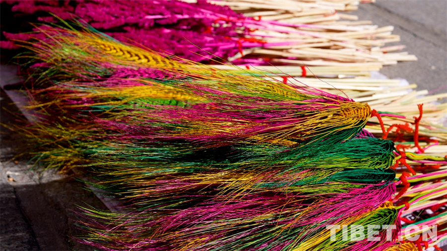 在藏歷新年年貨物品中,提及酥油花就不得不提它的“搭檔”“羅薩梅朵”,正是因?yàn)樗鼈兊难b點(diǎn)讓藏歷新年中本身就已很精致的“切瑪盒”更加亮眼?!傲_薩梅朵”被稱為“冬季里最美麗的花”,是經(jīng)過染色的麥穗和青稞穗制作成的“花卉”。在藏歷新年或節(jié)日之時(shí),人們將其插在盛滿糌粑和青稞的“切瑪盒”上,寓意新的一年美滿、豐收。