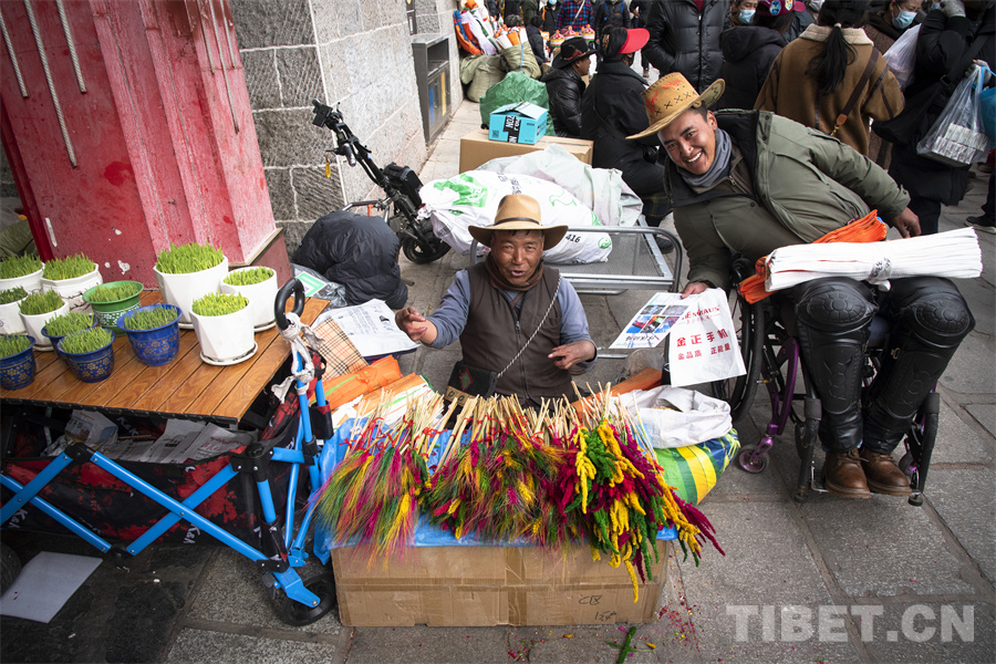 普瓊,來自日喀則市江孜縣,在八廓商城南門前經(jīng)營著自己的“羅薩梅朵”小攤。初見普瓊,我們被他沖著鏡頭的燦爛笑容所吸引。細(xì)細(xì)觀察,普瓊坐在地上的身高卻比別人矮了一大截?!拔覀儚睦_堆龍德慶的批發(fā)市場上買來這批‘羅薩梅朵’在此銷售,就希望能夠在年前的這段時(shí)間多賺些小錢補(bǔ)貼家用,所有人都想在新年之時(shí)過個(gè)充裕的‘好年’,不是嗎?”普瓊因一次意外高位截癱,失去雙腿的他并沒有消沉。他選擇積極面對生活,用自己的雙手和命運(yùn)抗?fàn)?,用?jiān)強(qiáng)和勤勞讓自己和全家過上更好的生活。與普瓊不幸的經(jīng)歷相比,我們每個(gè)人過的每個(gè)年何嘗不都是一個(gè)個(gè)“好年”呢?普瓊對生活的那種熱愛,對明天會(huì)更好的堅(jiān)定,何嘗不是我們對每一個(gè)“好年”所孜孜追求的呢?