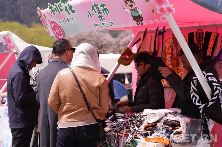 沿著蜿蜒的小路,一邊是錯(cuò)落有致的桃花樹,一邊是特色集市。“這些是工布男女服飾、這是馬套、這是藏式包包……都是我們合作社的工作人員手工制作的?!痹谖枧_(tái)一旁的桃花小集市,林芝市巴宜區(qū)絲綢藏裝定制農(nóng)牧民專業(yè)合作社負(fù)責(zé)人尼瑪扎西正向游客一一介紹自家展銷點(diǎn)的產(chǎn)品以及其背后的文化和制作過(guò)程。經(jīng)過(guò)一番討價(jià)還價(jià),一千余元的“大單子”順利成交,游客將一件件精美的巴宜“小禮品”裝進(jìn)袋子和尼瑪扎西揮手告別。