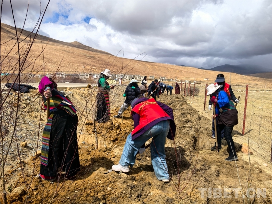 伴隨著一次次鐵鍬鑿擊地表的“嚓嚓”聲、此起彼伏的藏語勞動(dòng)歌曲和樹苗抖動(dòng)的“沙沙”聲,一排排規(guī)整的樹坑網(wǎng)格慢慢被鑿出,一棵棵象征希望的樹苗緩緩落下,一抔抔承載著綠色生命的黃土再次埋下,村主干道邊綿延80余米的“綠色生命線”初見雛形,120余棵樹苗挺立村道兩側(cè),以“綠絲帶”串聯(lián)村莊,為春日家園增添盎然生機(jī)。