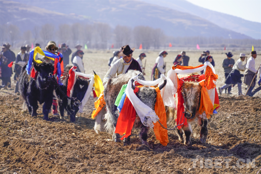 祈福儀式后,極具民族特色的二牛抬杠耕作表演精彩上演。來自三個(gè)片區(qū)的耕作者身著藏繡華服,用哈達(dá)裝飾耕牛,以傳統(tǒng)木犁翻土開壟,在雄渾的勞動(dòng)號(hào)子中,勾勒出千年農(nóng)耕文明的鮮活圖景。