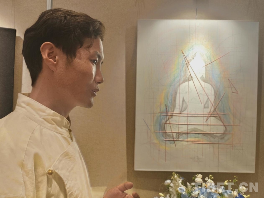 圖為5月2日至8日舉行的“三國(guó)同框 四季如畫(huà) 五彩亞?wèn)|——亞?wèn)|縣文化交流及特色產(chǎn)品展銷活動(dòng)”上,亞?wèn)|青年藝術(shù)家索喃次仁在介紹他的作品 攝影:趙釗