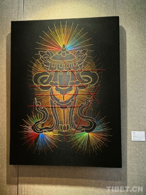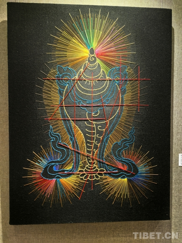 索喃次仁的作品慣以手工羊絨布為面,彩色羊毛線為語(yǔ)言,呈現(xiàn)標(biāo)志性的“彩虹”元素。“(西藏)傳統(tǒng)的藝術(shù)是有一定標(biāo)準(zhǔn)的,而當(dāng)代藝術(shù)是可以無(wú)界的,包括材質(zhì)、材料都可以有所創(chuàng)新,是表達(dá)個(gè)人情感和生活的一種藝術(shù)形式。我常常問(wèn)自己,能不能突破傳統(tǒng)?可不可以做一些比較新的東西?像我現(xiàn)在創(chuàng)作選擇用羊絨布,就是我的一種情感表達(dá),因?yàn)椋ㄋ┡c我的家鄉(xiāng)有深切關(guān)系?!彼鬣稳式忉尩?/span>:“比如說(shuō)這一幅作品,佛像外呈現(xiàn)出一種彩虹的狀態(tài)。因?yàn)椴屎绫旧硎且粋€(gè)無(wú)常的現(xiàn)象,而我之前學(xué)過(guò)唐卡佛像,所以把佛像和彩虹理念結(jié)合了,這既是一種傳承,也是突破?!?/span>