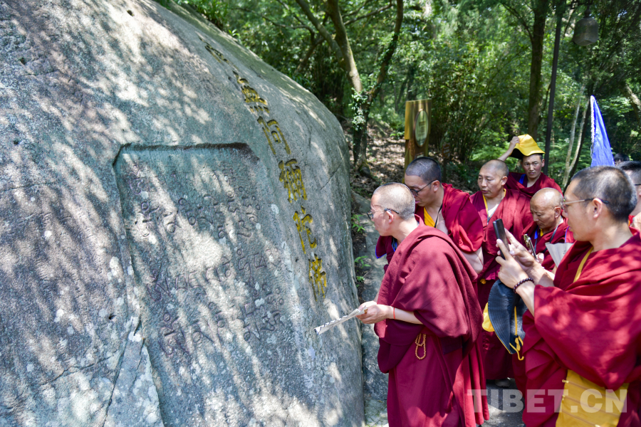 圖為西藏佛學(xué)院師生被普陀山西天景區(qū)藏文雕刻所吸引 攝影:趙振宇