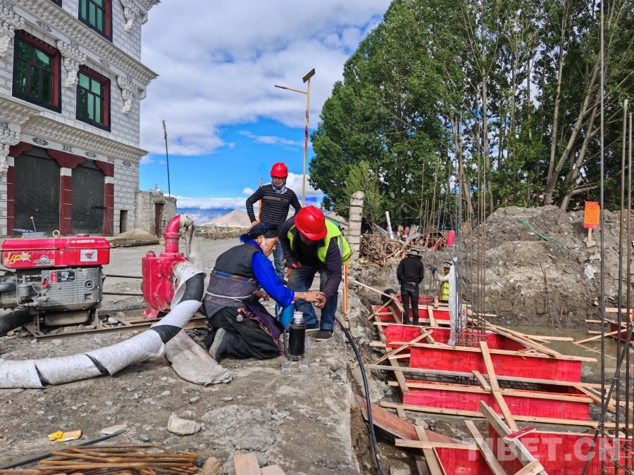 在仲康村巴桑家的重建工地上,工程已進入鋼筋捆扎階段。一場突如其來的夜雨導(dǎo)致基坑積水。清晨七八點,施工隊員已在基坑中忙碌開來,有的加緊捆扎鋼筋,有的尋找水泵抽水。日頭漸高,汗水浸濕了工人們的額頭,他們卻無暇休息。這時,阿媽巴桑提著一壺剛煮好的甜茶走來,就地一杯杯沏好,熱情地招呼這群“小伙子”?!耙郧暗睦戏孔诱饓牧耍F(xiàn)在黨和政府給我們建更好的新房子,日子肯定越過越有盼頭!”樸實的話語里,滿是她對未來的憧憬和對援助的感激。