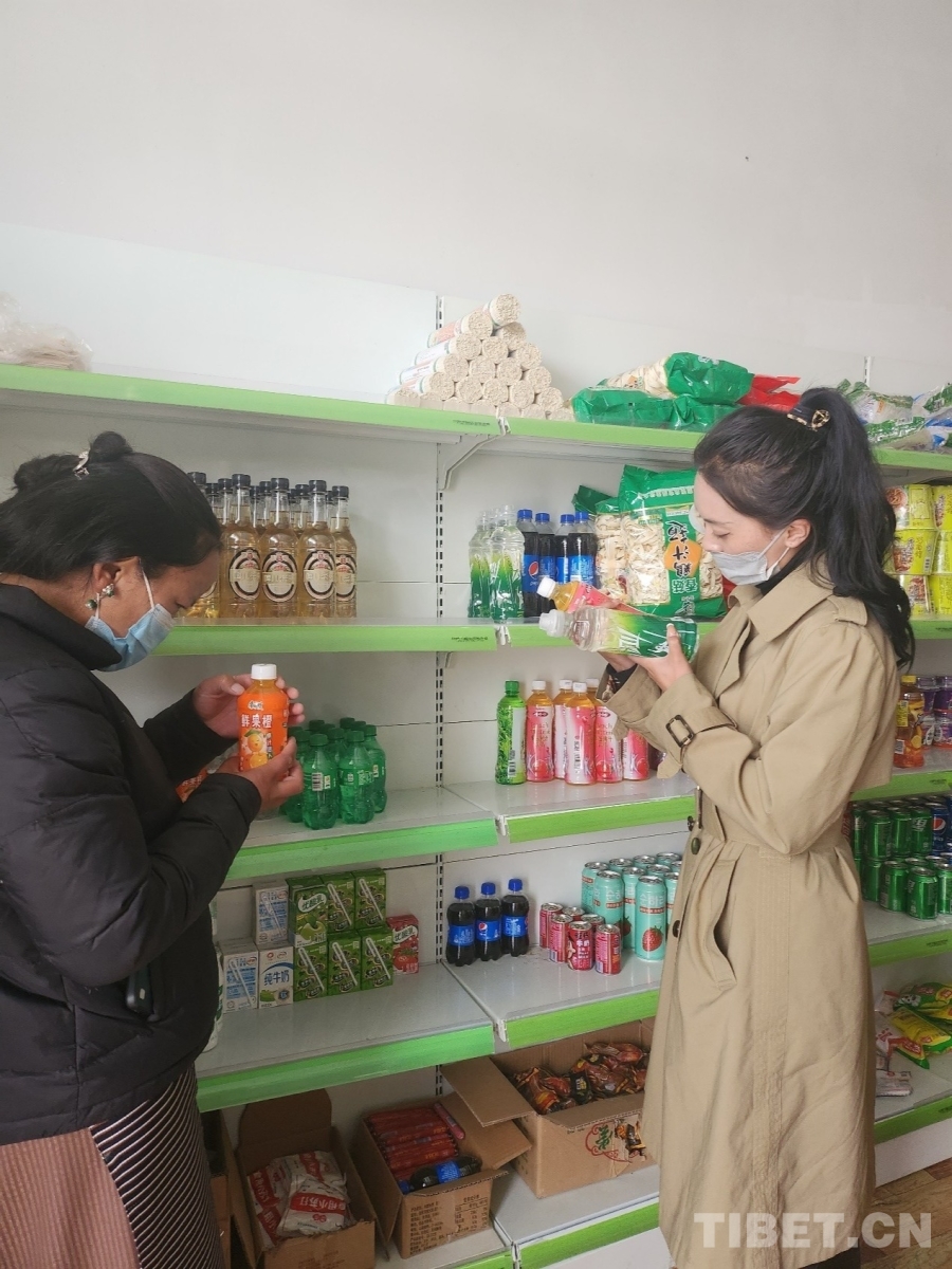 圖為次仁嘎措在村小賣部檢查食品保質期 受訪者供圖